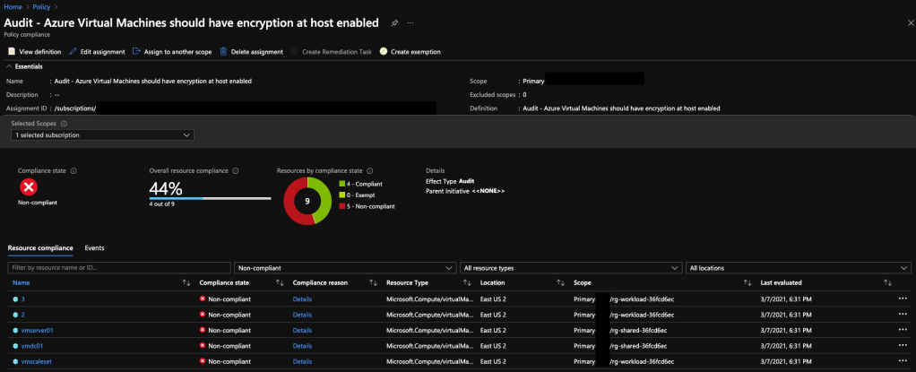 Take note that after adding a new policy assignment, I’ve found that running a scan immediately after adding the assignment results in the new assignment not being evaluated. Since I’m impatient I didn’t test how long I needed to wait and instead ran another scan after the first one. Each scan can take up 10 minutes or longer depending on the number of resources being evaluated so prepare for some pain when doing your testing.