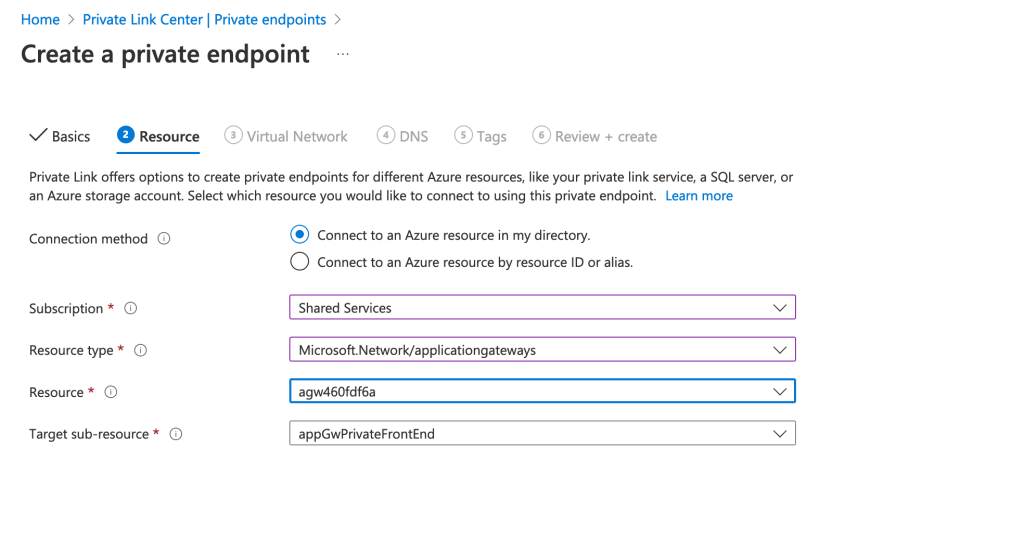 - Setup for the consumer is very simple. All you need to do is provide them with the resource id of the application gateway and the listener name. They can then use the native Private Endpoint creation experience to setup access to your service.