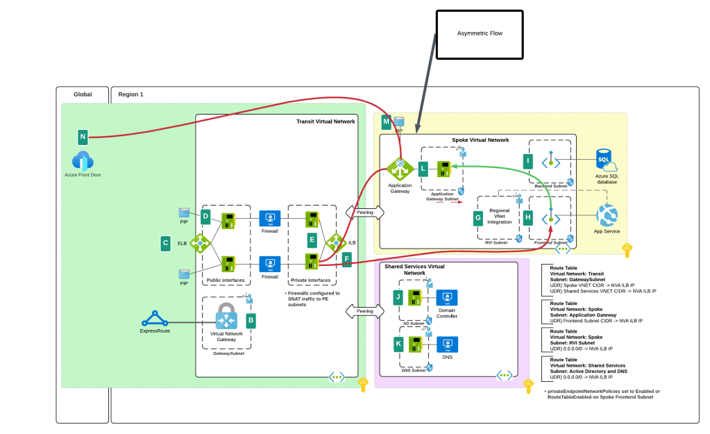 The routing when inspecting traffic to services which receive their inbound traffic via a Private Endpoint (such as an App Service running in a Premium App Services Plan, a Storage Account, a Key Vault, etc) that inspection gets more challenging. These challenges exist for both controlling the traffic to the Private Endpoint and controlling the return traffic.