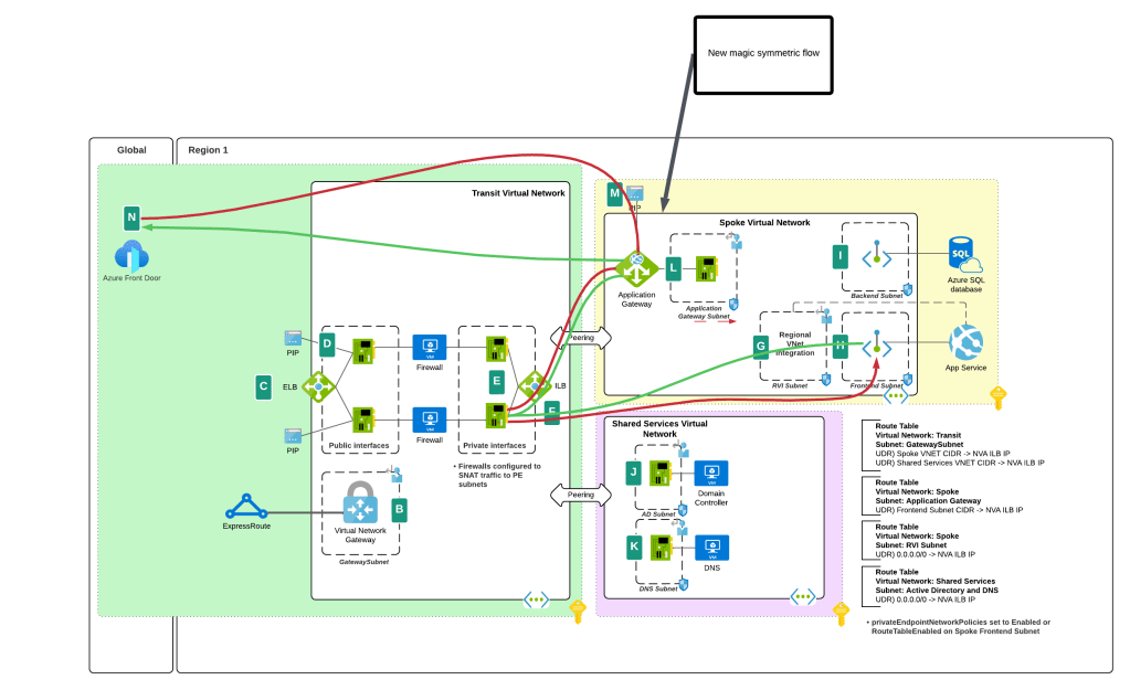 Organizations in the regulated space frequently have security controls where a simple 5-tuple-based firewall rule at OSI layer 4 won’t suffice and traffic inspection needs to occur to analyze layer 7. Take for an example a publicly facing web application deployed to Azure. These applications can be subject to traffic inspection at multiple layers like an edge security service (Akamai, CloudFlare, FrontDoor, etc) and again when the traffic enters the customer’s virtual through a security appliance (F5, Palo Alto, Application Gateway, Azure Firewall, etc). Most of the time you can get away with those two inspection points (edge security service and security appliance deployed into virtual network) for public traffic and one inspection point for private traffic (security appliance deployed into virtual network and umpteenth number of security appliances on-premises). However, that isn’t always the case.