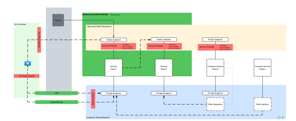 - Network Security Perimeters rules apply only to public traffic, this means traffic incoming to the service’s public IP on the Microsoft public backbone or leaving the service the Microsoft public backbone. They do not affect traffic coming in through a Private Endpoint.